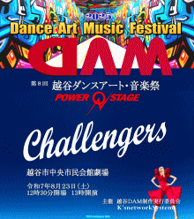 第9回越谷ダンスアート音楽祭 出演者・団体チーム募集 第9回越谷ダンスアート音楽祭 出演者・団体チームを募集します。 真夏の8月23日(日)のダンス音楽イベントです。 日頃の練習の成果をぜひ舞台でご披露してください。 <募集ジャンル> ダンス部:ヒップホップ、ジャズ、チア、フラ、ストリート等。 音楽部:アコースティックギター、和太鼓、笛等。 アート部門:ヨーヨー、腹話術、コマ、手品等 日時 令和8年8月23日(日)午前リハーサル 午後1時~ 開演 場所 越谷市中央市民会館1階劇場 出演エントリー お一人3000円(入場チケット2枚・プログラム等含) 応募締切りは6月末日まで。 ※応募多数の場合は自動締切り ご応募お待ちしております。 「どなたでも楽しめるステージ」をコンセプトに子供から大人まで楽しめる 舞台発表する場をご提供しています。 日頃のダンス活動や音楽活動の成果を舞台で 発表してみませんか? 皆さんのご応募、参加をお待ちしております。 舞台でおもいっきり楽しんでみましょう! ご興味のある方は、お気軽にお問い合わせください。 越谷DAMメール:koshigaya.dam@gmail.com 担当:小林 下記応募フォームよりご応募ください |